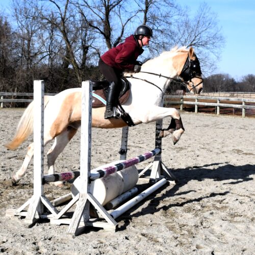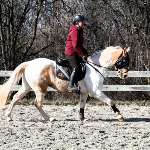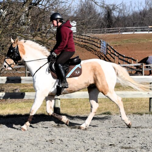 Apollo is an exceptional prospect to bring along! He has three beautiful gaits with a big expressive trot and a well balanced canter. He was started from scratch in October and is coming along nicely. While he has his quirks (hence the blinders) he is willing and will progress quickly. Apollo will definitely need someone with a quiet and patient attitude. He needs someone who is willing to take the time to develop him. You won't be sorry as he is quite special! Apollo is currently doing basic flatwork and jumping small fences with ease! He showed a ton of scope in the jump chute as well. He has a sweet personality and hacks out well alone and in a hack. Apollo is a super fancy prospect that would be suitable for a confident junior/ young rider or adult amatuer to bring along.
