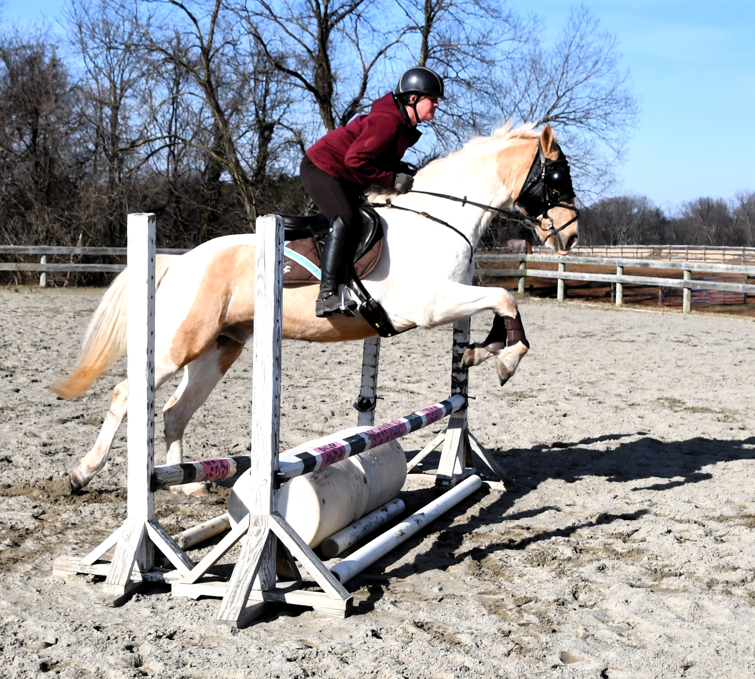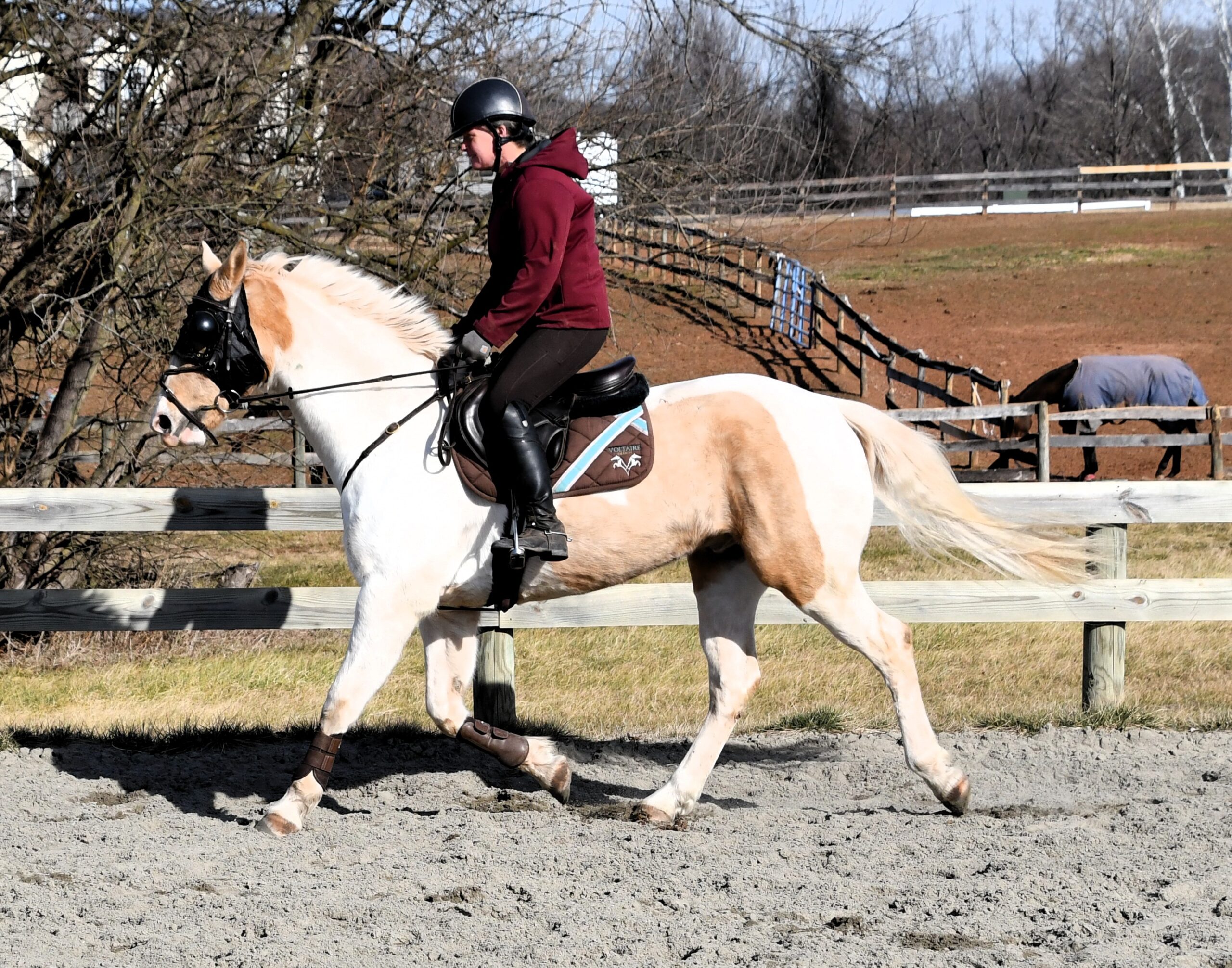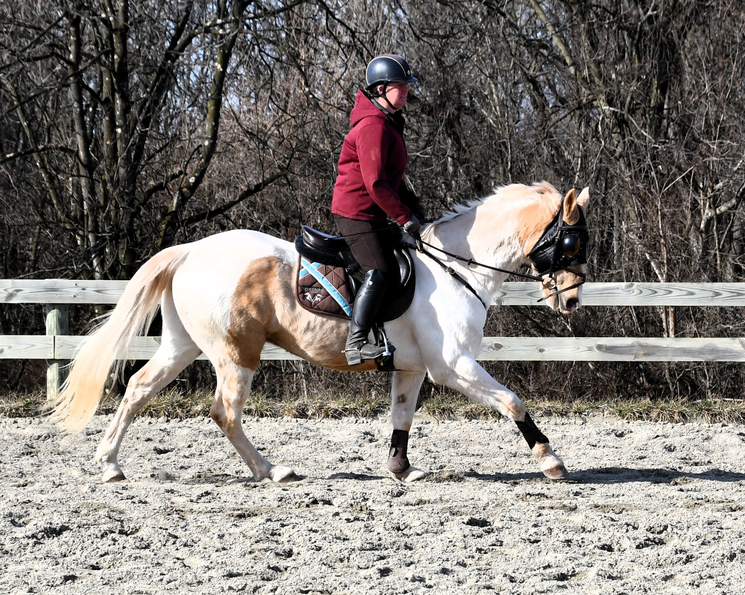 Apollo is an exceptional prospect to bring along! He has three beautiful gaits with a big expressive trot and a well balanced canter. He was started from scratch in October and is coming along nicely. While he has his quirks (hence the blinders) he is willing and will progress quickly. Apollo will definitely need someone with a quiet and patient attitude. He needs someone who is willing to take the time to develop him. You won't be sorry as he is quite special! Apollo is currently doing basic flatwork and jumping small fences with ease! He showed a ton of scope in the jump chute as well. He has a sweet personality and hacks out well alone and in a hack. Apollo is a super fancy prospect that would be suitable for a confident junior/ young rider or adult amatuer to bring along.