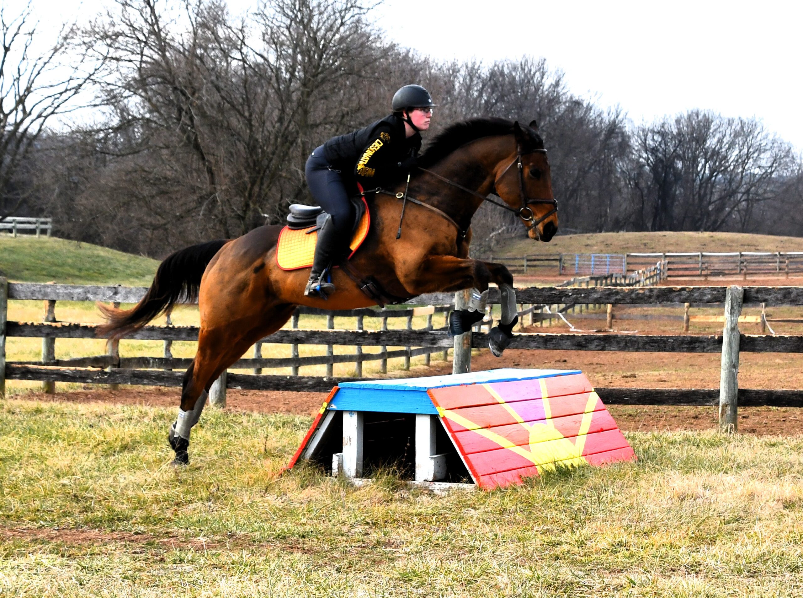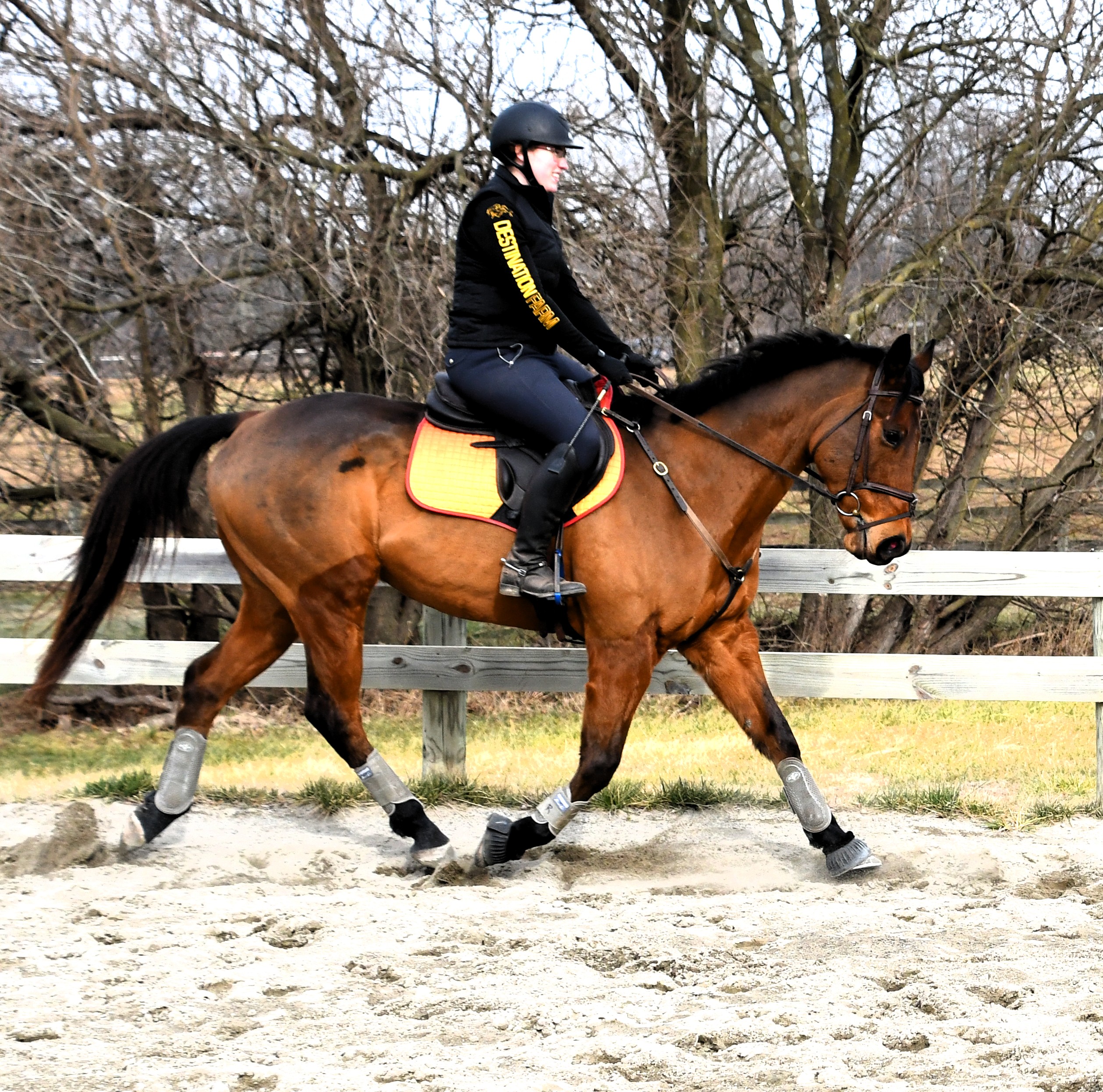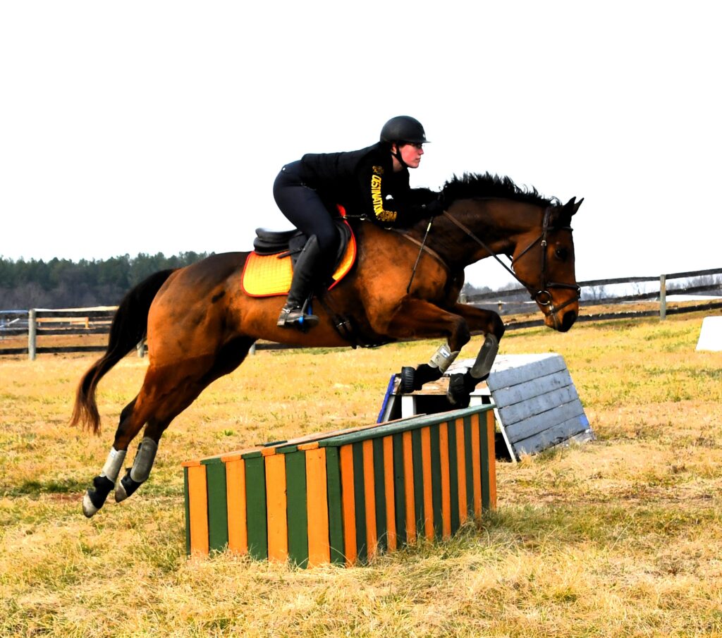 "Red" has been off the track since 2022 (purchased from his breeder) and has lots of hacking out experience - roads, trails, open fields, ditches, water, bridges both with big groups and alone. He's been on a hunter pace and some hunt trail rides as well. This past fall Red started doing more dressage and jumping training and has started to event- He scored a 21 in his first event! He's a lovely mover and scopey jumper! He is currently competing BN, schooling novice with ease, and shows excellent potential to progress quickly. Red also has an excellent temperament and is suitable for an adult amateur or junior/young rider to bring along.
